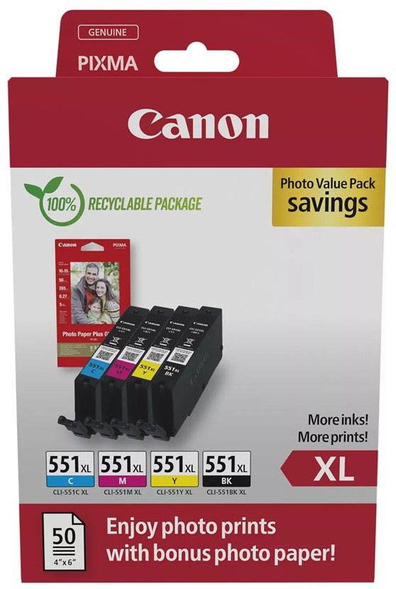 Artikelomschrijving Canon photo value pack CLI-551XL, 660 pagina's, OEM 6443B008, 4 kleuren