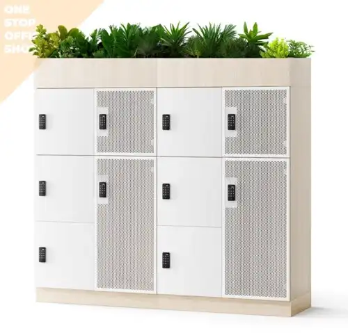 Deze modulaire lockerkast is ontworpen voor een maximale flexibiliteit en kan eenvoudig worden aangepast of uitgebreid naar uw specifieke behoeften. Dit maakt ze bijzonder geschikt voor een verscheidenheid aan ruimtes en gebruik scenario’s. Ze zijn niet alleen populair in woonruimtes, maar vooral in werkruimtes vanwege hun veelzijdigheid en aanpasbaarheid. De lockerkast is verkrijgbaar in diverse kleuren, meerdere frame kleuren, en verschillende stijlen, en biedt daarnaast keuze uit vier soorten sloten. Zo kunt u de uitstraling en de functionaliteit kiezen die het beste bij uw omgeving past. Hoewel deze lockerkast exclusief de getoonde accessoires wordt geleverd, is deze eenvoudig zelf te monteren. Indien gewenst, bieden wij ondersteuning bij de installatie. Voor grotere opstellingen kunnen meerdere lockerkasten aan elkaar worden verbonden en gekoppeld, wat ideaal is voor het creëren van een samenhangend geheel. Deze lockerkasten zijn beschikbaar in een breed scala aan kleuren en configuraties, waardoor ze geschikt zijn voor plaatsing in kantines, kantoorruimtes, welkomsthallen, sportfaciliteiten, onderwijsinstellingen, en recreatiecentra. Ze bieden een stijlvolle en praktische oplossing voor opslag die zowel functioneel als esthetisch aantrekkelijk is, ideaal voor het scheppen van een georganiseerde en uitnodigende omgeving. De prijs is gebaseerd op de standaard uitvoering in melamine zoals afgebeeld op afbeelding 1 (excl. beplanting). Fineer of HPL deuren kunnen een meerprijs hebben. Standaard wordt de kast uitgevoerd met cilindersloten met sleutel. Combinatiesloten en elektronische sloten hebben een meerprijs. Vraag voor meer informatie een offerte op.