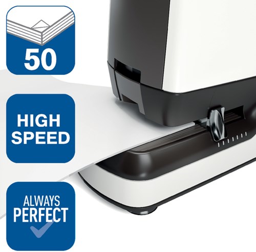 Met de Pro 90EC elektrische nietmachine kun je op hoge snelheid moeiteloos tot 50 vellen papier tegelijk nieten (80 g/m²), waardoor je tijd bespaart op je werk.