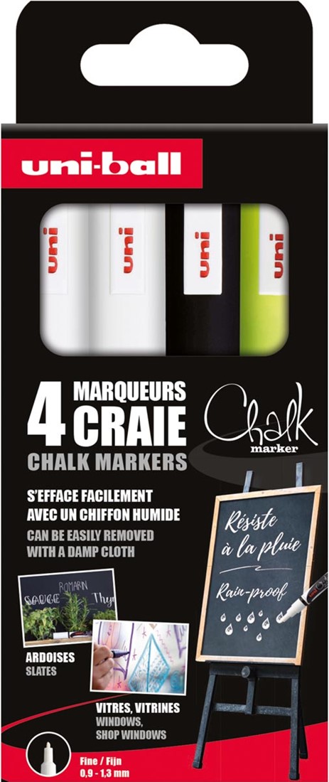 Artikelomschrijving Uni-ball krijtmarker, ronde punt van 0,9-1,3 mm, etui van 4 stuks, assorti