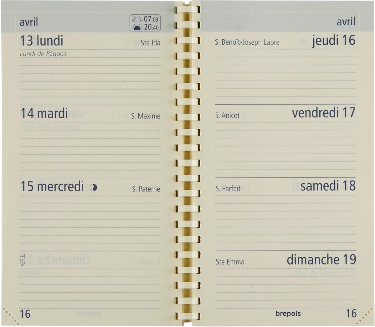 1 week per 2 pagina's Spiraalgebonden Crèmekleurig papier van 60 g/m² 128 pagina's Grote letters en cijfers voor een optimale leesbaarheid Met scheurhoekjes Kaft uit zacht kunstleder met een kalfsleder look Ft 90 x 160 mm Certificaat: FSC Mix