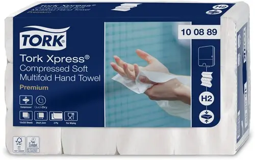 Artikelomschrijving Tork Xpress® gecomprimeerde zachte handdoek, multifold Z, Premium, 2-laags, systeem H2, 12 x 225 vel