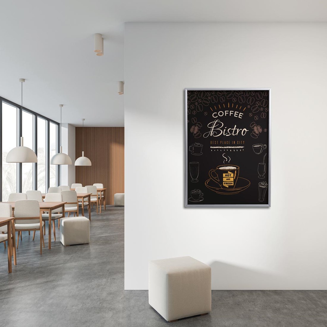 Uit geanodiseerd aluminium met polystyreen achterzijde Easy-Click systeem Voorzetfolie beschermd de poster tegen vuil en vocht Profiel van 25 mm met versterkte hoeken Inclusief bevestigingsmateriaal