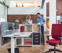 De Sedus Grand Slam kasten modules zijn zeer geschikt voor de zone-indeling bij het bureau en biedt direct opbergruimte voor alles wat je onder handbereik wilt hebben. Deze kast dient als afscheiding voor de behoefte aan privésfeer maar ook direct als afscheiding van zones in een open kantoor. Deze kast biedt opbergruimte, maar biedt ook de ruimte om het tafelblad in de opbergruimte te plaatsen. Zo wordt het werkoppervlak groter en wordt het bureau en kast één geheel. Het geheel ziet er goed uit en voelt nog prettiger aan. Door de toegang vanaf beide zijden kunnen ook modules onder het tafelblad als opbergruimte worden gebruikt, ruimte die anders verloren zou gaan.