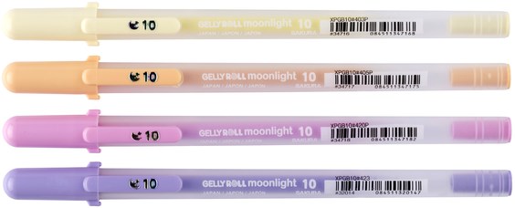 Moonlight Gelly Roll pennen zijn verkrijgbaar in fijne en medium lijnbreedtes en verschillende heldere kleuren, waaronder fluorescerende en pastelkleuren.