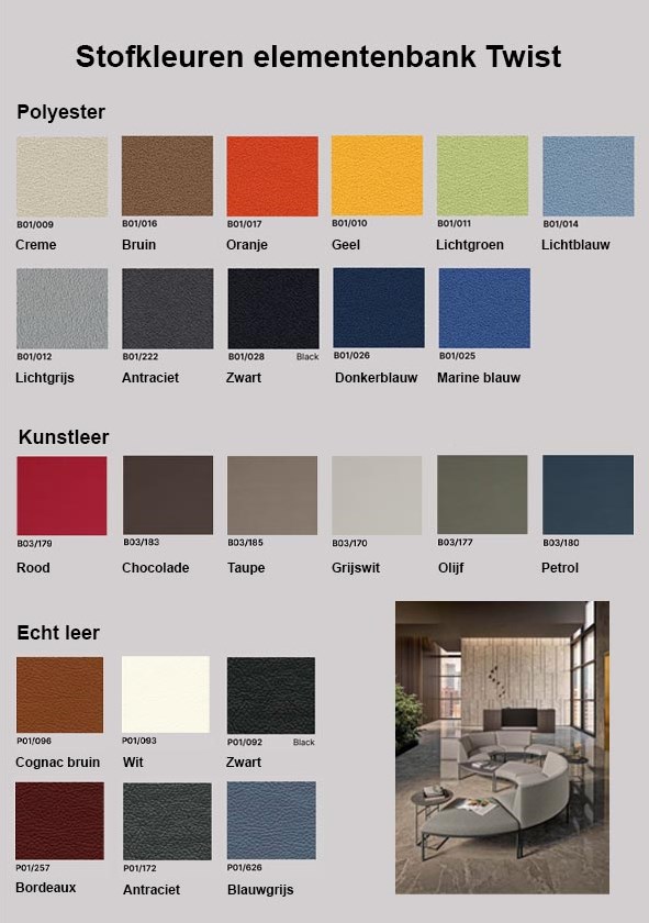 Voor deze modulaire bank zijn er vele stofferingen mogelijk. Bekijk het volledige aanbod op de volledige kleurenkaart, zie PDF. We hebben een selectie uit dit grote aanbod gemaakt die je via onze website kunt bestellen. Staat jouw keuze er niet bij? Geef dan de kleur van jouw keuze aan bij je bestelling. Natuurlijk kun je ook altijd contact met ons opnemen.