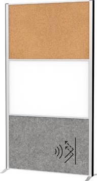 Samenstelling: 1 x whiteboard, 1 x kurk paneel, 1 x akoestisch donkergrijs paneel , frame zilver, met voet
