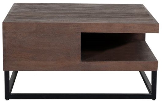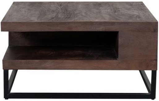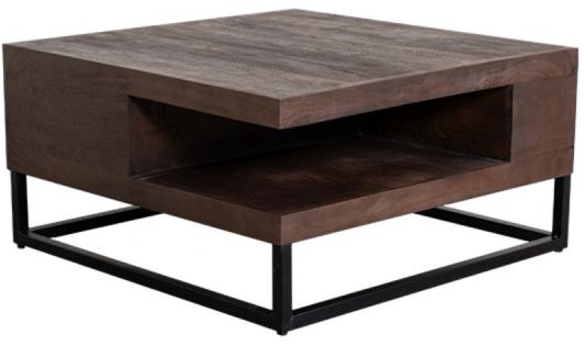 Deze mangohouten salontafel heeft een vierkante vorm en een speelse indeling met opbergruimte. De houten salontafel is van massief mangohout en staat op een robuust zwart stalen frame. Het frame zorgt voor en luchtig karakter en maximale stabiliteit en stevigheid.