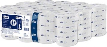 Tork OptiServe® Hulsloos Toiletpapier Wit T7: Tork OptiServe® Hulsloos is een hulsloos toiletpapiersysteem met grote capaciteit voor faciliteiten waar efficiëntie, duurzaamheid en beleving centraal staan. De dispenser heeft een hoge capaciteit, neemt minder ruimte in beslag en is gecertificeerd 'Easy-to-use': dit is een beter alternatief voor traditioneel toiletpapier en jumbo toiletrollen. Deze 2-laagse hulsloze toiletrollen passen in een groot assortiment compatibele dispensers voor hulsloos toiletpapier om te voorzien in de wensen voor verschillende sanitaire ruimten. Zo kunnen dezelfde compacte vullingen gebruikt worden in het hele gebouw. In vergelijking met traditioneel toiletpapier bevatten de Tork OptiServe® hulsloze rollen 3 keer meer papier, zonder huls of wikkel voor minder afval.