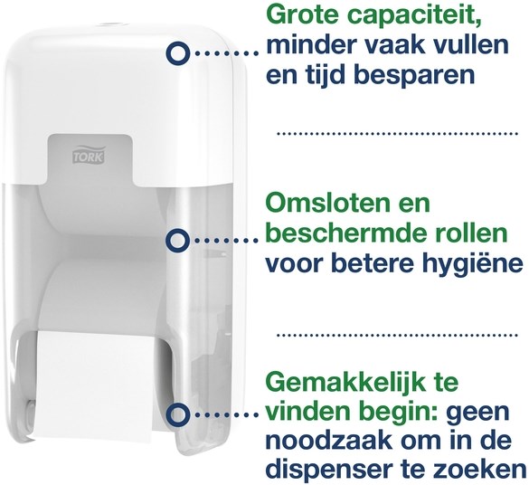Tork OptiServe® Dispenser voor 2 Rollen Hulsloos Toiletpapier Wit T7: Tork OptiServe® Hulsloos Dispenser is een hulsloos toiletpapiersysteem met grote capaciteit voor faciliteiten waar efficiëntie, duurzaamheid en beleving centraal staan. De dispenser heeft een hoge capaciteit, neemt minder ruimte in beslag en is gecertificeerd 'Easy-to-use': dit is een beter alternatief voor traditioneel toiletpapier en jumbo toiletrollen. Deze verticale papierdispenser voor twee rollen maakt deel uit van een groot assortiment om te voorzien in de wensen voor verschillende sanitaire ruimten. Zo kunnen dezelfde compacte vullingen gebruikt worden in het hele gebouw. In vergelijking met traditioneel toiletpapier bevatten de Tork OptiServe® hulsloze rollen 3 keer meer papier, zonder huls of wikkel voor minder afval.