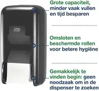 Tork OptiServe® Dispenser voor 2 Rollen Hulsloos Toiletpapier Zwart T7: Tork OptiServe® Hulsloos Dispenser is een hulsloos toiletpapiersysteem met grote capaciteit voor faciliteiten waar efficiëntie, duurzaamheid en beleving centraal staan. De dispenser heeft een hoge capaciteit, neemt minder ruimte in beslag en is gecertificeerd 'Easy-to-use': dit is een beter alternatief voor traditioneel toiletpapier en jumbo toiletrollen. Deze verticale papierdispenser voor twee rollen maakt deel uit van een groot assortiment om te voorzien in de wensen voor verschillende sanitaire ruimten. Zo kunnen dezelfde compacte vullingen gebruikt worden in het hele gebouw. In vergelijking met traditioneel toiletpapier bevatten de Tork OptiServe® hulsloze rollen 3 keer meer papier, zonder huls of wikkel voor minder afval.