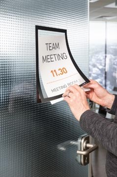 Met de Infotas zelfklevende A4 Durable Duraframe in zwart kun je snel en eenvoudig informatie tonen. Dit kader bestaat uit twee transparante folies die met een magnetische rand bij elkaar worden gehouden. Hierdoor kun je de informatie eenvoudig vervangen. Het kleeft op alle vlakke ondergronden en is herpositioneerbaar. Dit maakt het ideaal voor het ophangen van deurborden, aanbiedingen of signalisatie. Bij bevestiging op glas is de informatie van beide zijden leesbaar. De rand heeft dezelfde kleur aan de voor- en achterzijde. Je kunt het kader zowel in staand als liggend formaat gebruiken.