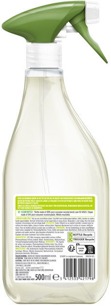 Fles body is gemaakt van 100% gerecycled plastic, grotendeels recyclebaar. Sproeikop gemaakt van 30% gerecycled plastic (PCR).