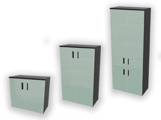 - Deuren: glazen draaideuren (hoge kast: 4 deuren; lage/middelhoge: 2 deuren)