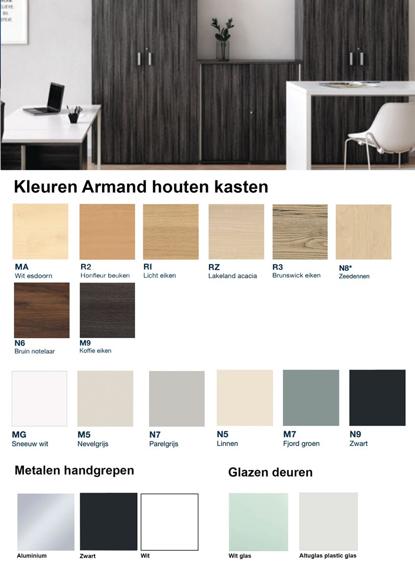 Zoals je van de Armand-serie mag verwachten, zijn de kasten hoogwaardig afgewerkt met solide sluitwerk en duurzame materialen. Combineer verschillende hoogtes of mix met gesloten draaideurkasten en schuifdeurkasten voor een uniforme, representatieve kastenwand.