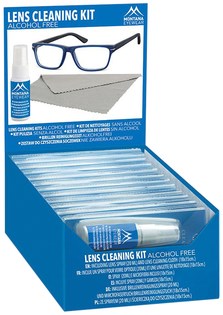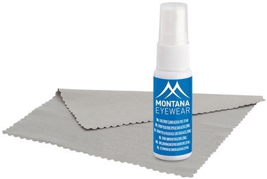 Brillenpoetsset bestaande uit een microvezel doekje en een flesje reinigingsvloeistof van 20 ml zonder alcoholx.