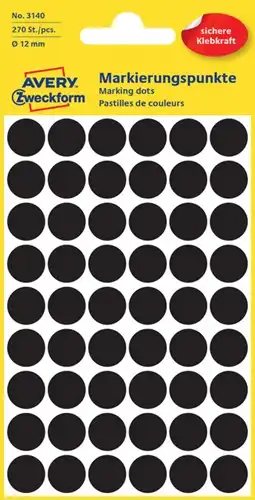 Avery Etiketten diameter: 12 mm, 270 etiketten per doos. 54 etiketten per vel, kleur: zwart