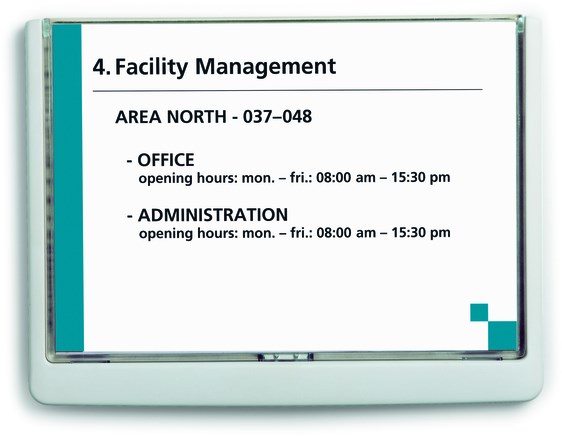 Dit CLICK SIGN deurbordje is gemaakt van kunststof en ideaal voor het tonen van informatie. Het is eenvoudig te gebruiken en perfect voor onderwijsinstellingen, ziekenhuizen en horeca. Je vervangt de kartonnen inserts snel door het zichtvenster eruit te trekken. Dit maakt het bordje handig voor grootschalig gebruik. Bij het deurbordje krijg je een montageset, boorsjabloon en handleiding. Je kunt het bordje vastschroeven of vastplakken. De bijpassende printbare kartonnen inserts zijn apart verkrijgbaar. Dit deurbordje is geschikt voor A5 inserts.