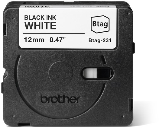 Originele Brother Btag-231 tapecassette met niet-gelamineerde, witte labeltape en zwarte tekst voor het maken van labels van 12 mm breedte.