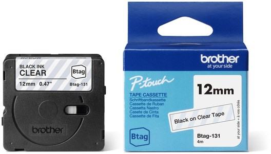 Originele Brother Btag-131 tapecassette met niet-gelamineerde, transparante labeltape en zwarte tekst voor het maken van labels van 12 mm breedte.