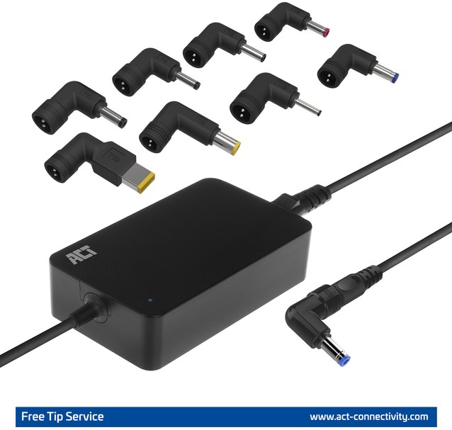 Gratis tip service. ACT levert 8 plugjes/tips mee met de AC2055 Notebook Charger. Deze 8 tips zijn geschikt voor de meest gebruikte laptops. Heb je toch een andere plug nodig? Geen probleem! Vraag via onze website een gratis plug aan.