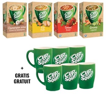 Actie Cup a Soup 1x champignon crouton, 1x kip, 1x tomaat crouton, 1x groenten crouton + GRATIS mokken