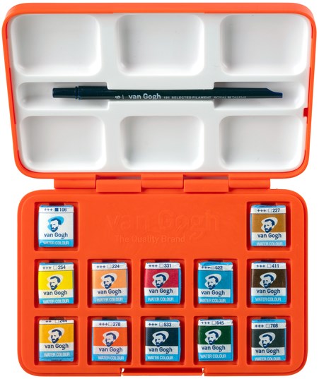 Een compacte aquarelverfset met twaalf kleuren geïnspireerd op het kleurenpalet van Vincent van Goghs dynamische Zelfportret met grijze vilthoed waarbij hij gebruikmaakte van complementaire kleuren. Deze speciale uitvoering van de Van Gogh pocket box is feloranje, zoals de kleine streepjes oranje verf die ook terug te zien zijn in de aureool om het hoofd op het zelfportret. Dit maakt de aquarelverf pocket box een waar collectors item.
