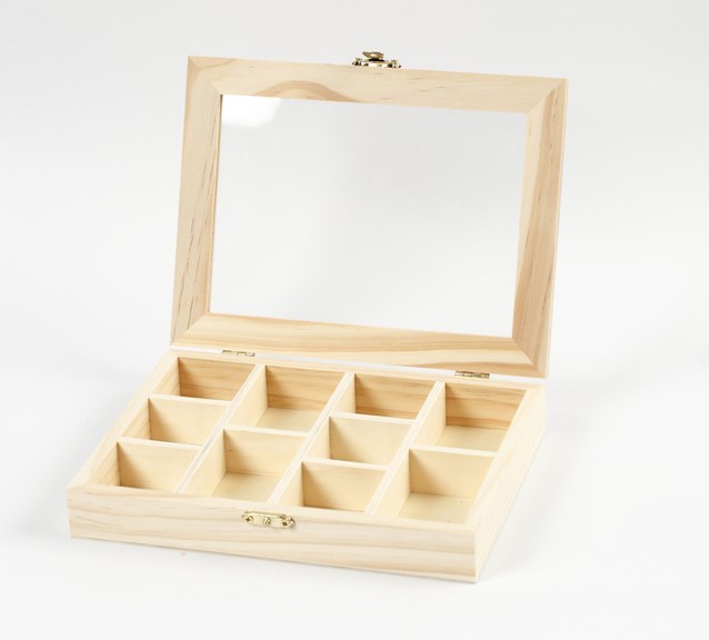 Houten doos met glazen deksel en metalen sluiting verdeeld in 10 vakken in 2 maten. Ideaal voor decoratie met acrylverf, porseleinstiften, mozaïek en nog veel meer! Afmetingen:15,5x20,5x3,5 cm.