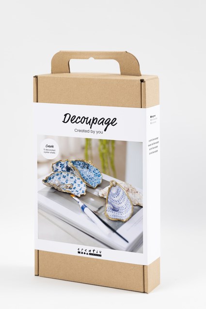 Met Creativity in a Box kunt u de schatten van de zee omtoveren in mooie en unieke decoupageschalen – ideaal om sieraden en andere kleine spulletjes in op te bergen. De set bevat materialen voor vijf gedecoreerde oesters en alle instructies die u nodig hebt. Haal het zomerplezier van de kust in huis. Met onze Creativity in a Box maakt u eenvoudig de meest onweerstaanbare oesterschelpen met decoupagepapier. Versier de schelpen eerst met decoupagepapier, schilder vervolgens de randen met een gouden stift en geniet er tot slot van hoe ingrijpend mooi ze veranderd zijn. Elke oesterschelp is uniek. Nog steeds met de zachte, organische vorm, maar nu versierd met mooie ontwerpen in blauwtinten.