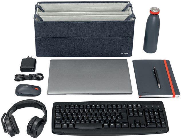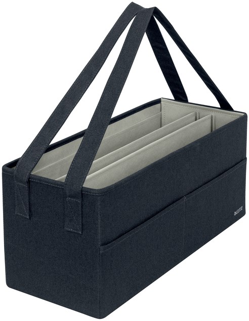De gestoffeerde opbergtas van Leitz is de perfecte oplossing om je werkspullen overzichtelijk op te bergen in een kast, op een plank of op je bureau. Met drie ruime compartimenten biedt deze open tas ruimte aan een laptop, toetsenbord, muis, kabels, headset, notitieblok en zelfs een drinkfles. Ideaal voor op kantoor, in het onderwijs of voor hybride werkplekken.