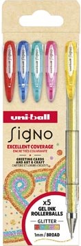 Uni-ball roller Signo Glitter, brede punt, geassorteerde kleuren, etui van 5 stuks