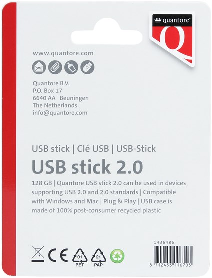 Sla je bestanden eenvoudig op met de USB stick van Quantore. Met 128GB opslagcapaciteit en USB 2.0-technologie is deze stick perfect voor het dagelijks gebruik van documenten, foto's en video's. De compacte, lichtgewicht behuizing is gemaakt van 100% gerecycled plastic en voorzien van een beschermkapje voor extra bescherming. Dankzij Plug & Play is de USB stick direct klaar voor gebruik op zowel Windows- als Mac-apparaten.