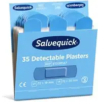 Salvequick Blue Detectable pleisters zijn in het bijzonder bedoeld voor gebruik in de levensmiddelenindustrie. De pleisters zijn detecteerbaar en worden door de meeste metaaldetectors ontdekt. Door de blauwe kleur kan de pleister ook gemakkelijk visueel worden ontdekt. De pleisters zijn op allergieën getest. Zij zijn gemakkelijk aan te brengen, flexibel en soepel te gebruiken.