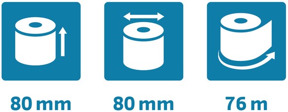 Afmetingen van de rol: breedte 80mm, diameter 80mm, lengte (+/- 2m) 76m.