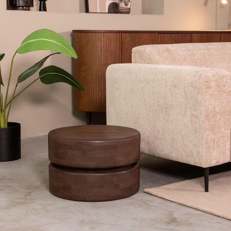 Salontafel Coffee is een ronde lage tafel van mangohout. Je kunt kiezen uit drie moderne natuurlijke kleuren; nature, espresso en zwart. De nature is perfect voor een natuurlijke sfeer, de diepe Espresso tint geeft een chique uitstraling en uitgevoerd als zwarte salontafel past hij in ieder modern kantoorinterieur. Het onderstel is een echte blikvanger: halverwege de voet zit een subtiele split, waardoor de tafel speels maar toch rustig oogt. De constructie is stevig en stabiel, geschikt voor dagelijks gebruik in een zakelijke omgeving.