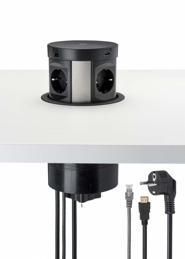 Met deze ronde pop up stekkerdoos van Ø12 cm maak je jouw bureau klaar voor de toekomst. Dankzij de combinatie van stroom, data en draadloos opladen is dit de ideale oplossing voor wie efficiënt en georganiseerd wil werken.