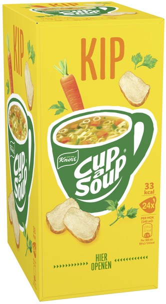 Heb je zin in een lekker soepje? Of heb je een drukke dag en zin in een snack om weer scherp en alert door te kunnen? Dan zit je bij Cup-a-Soup altijd goed! Zo ook met Cup-a-Soup Kip: een snelle, hartige opkikker die je weer energie geeft om door te gaan. Vol stukjes malse kip, maar ook met smaakvolle wortel, prei en peterselie voor een optimale smaak. In een verpakking Cup-a-Soup Kip zitten 24 heerlijke zakjes Cup-a-Soup. Een zakje van deze heerlijke Cup-a-Soup Kip bevat 41 calorieën per mok. Zoals je van ons gewend bent, besteden wij veel zorg en aandacht aan ons recept en gebruiken wij alleen de beste ingrediënten om de goede smaak te waarborgen. Daarnaast bevat deze Cup-a-Soup Kip geen kunstmatige kleurstoffen, conserveermiddelen of toegevoegde smaakversterkers. De Cup-a-Soup Kip is eenvoudig en snel te bereiden: doe de inhoud van het zakje in jouw favoriete mok en giet er 140 ml kokend water bij. Daarna eventjes roeren, 1 minuutje wachten en klaar, eet smakelijk! Zo bereid je binnen een handomdraai een heerlijke mok soep. Thuis, op kantoor of waar je ook bent, Cup-a-Soup is altijd een heerlijk hartig tussendoortje. Lekker, makkelijk en snel! 4-uur Cup-a-Soup: BAM! En weer helemaal scherp!