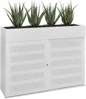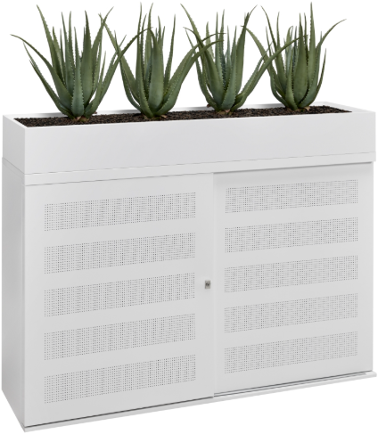 Met deze akoestische schuifdeurkast met geïntegreerde plantenbak voeg je praktische opbergruimte, geluidsdemping en een frisse, groene uitstraling toe aan je kantoor. De geperforeerde deuren met akoestische foam helpen om galm te verminderen, terwijl de plantenbak bovenop zorgt voor natuurlijke zonering en een prettigere werkomgeving.