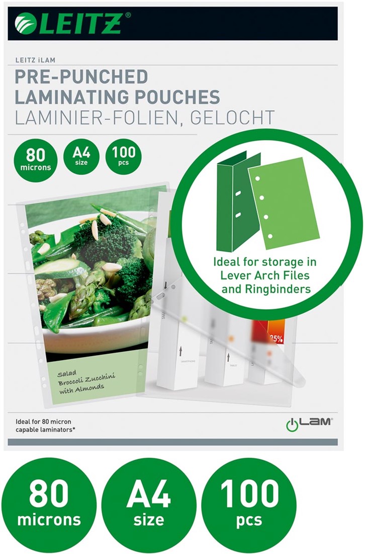 Lamineerhoes Leitz iLAM A4 met perforatieband 2x125micron EVA 100 stuks