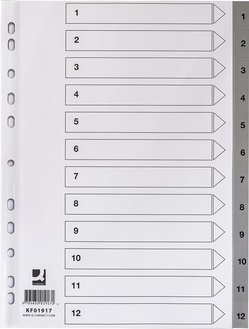 Artikelomschrijving Q-CONNECT tabbladen, A4, PP, 11-gaatsperforatie, met indexblad, set van 1-12, grijs