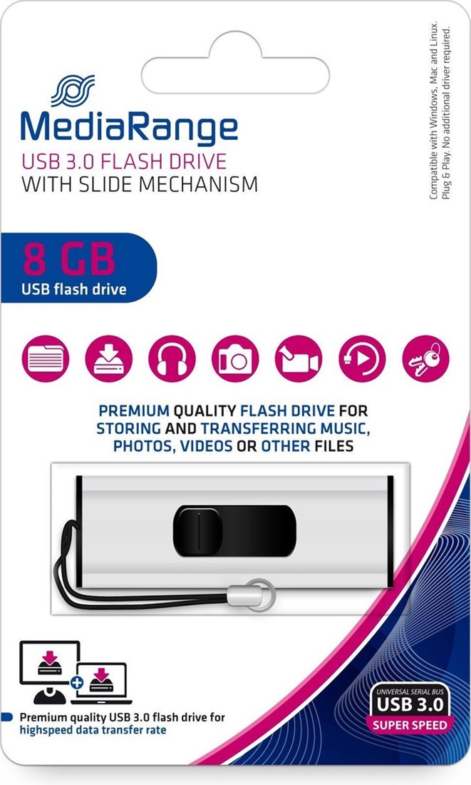 De compacte USB-stick van MediaRange is een snelle betrouwbare USB drive die makkelijk mee te dragen is naar al je afspraken. De flashdrive is ideaal voor dagelijks gebruik door het kleine ontwerp en de snelle gegevensoverdracht over USB 3.0 zo dat je altijd bij je data kan. De geheugenstick heeft een opslagcapaciteit van 8GB waarop je foto's, video's en andere bestanden veilig kan opslaan.