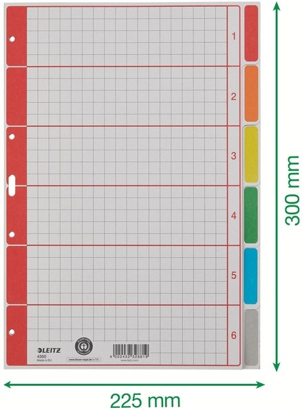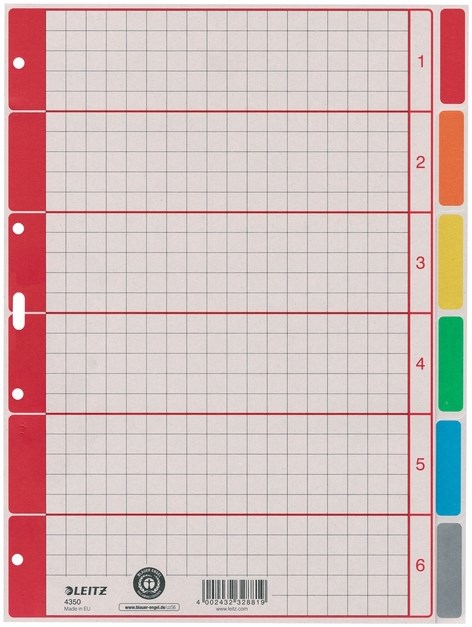 De 6 tabs in verschillende kleuren geven in één oogopslag een duidelijk overzicht. De tab bladen zijn geschikt voor A4 formaat ordners of ringebanden met 4 gaatsperforatie. De set heeft een geruit voorblad gemaakt van extra sterk 230 g/m² karton