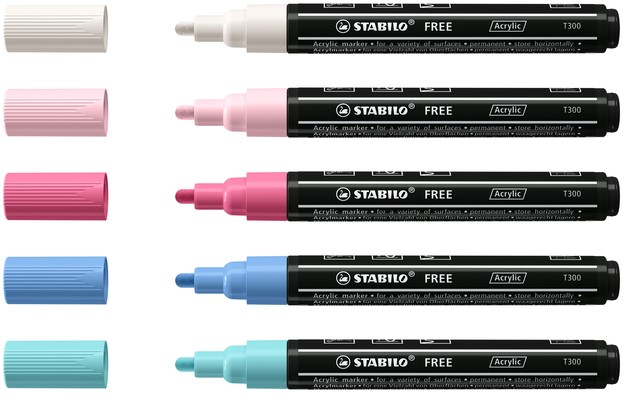 STABILO free acrylmarker T300 Urban, ronde punt, 2-3 mm, geassorteerde kleuren, pak van 5 stuks