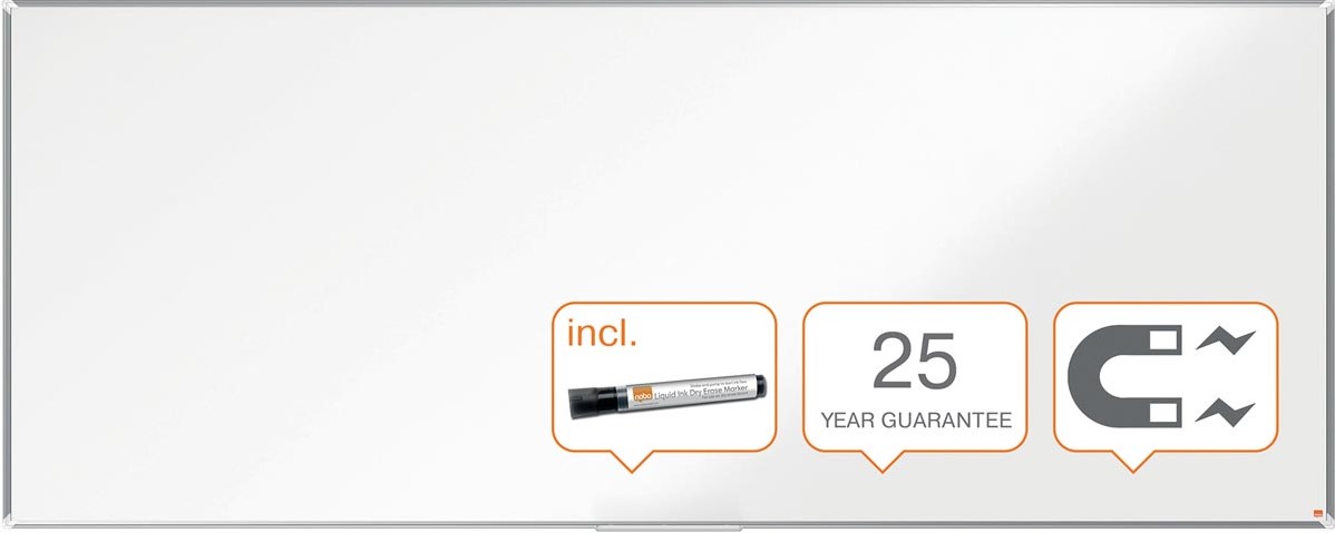 25 jaar garantie op het oppervlak Geëmailleerd, magnetisch oppervlak Uitstekend wisbaar Met modern, stijlvol aluminium frame Bevestigd aan de wand door traditionele hoekmontage Ruime pennengoot Met Nobo marker