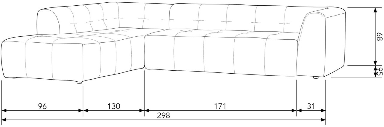 zitter en als hoekbank. Materiaal Grid is bekleed met onze superzachte stof: Ritini. De chenille geweven stof van 100% polyester heeft de zachtheid van velours en de sterkte van canvas. Met een Martindale van 45.000 is Grid dus wel bestand tegen een stootje en zeer geschikt voor intensief woongebruik. Het frame van de bank is opgebouwd uit spaanplaat, multiplex, softwood en solidwood. De zitting bevat een zigzag vering en HR 3032, T3037 foam wat zorgt voor comfortabel zitplezier. De rugleuning is gevuld met HR 2618, T1830 foam. Afmetingen De Grid hoekbank heeft een hoogte van 68 cm, een breedte van 298 cm en is in totaal 225 cm diep, het sofa gedeelte is 95 cm diep. De zithoogte is 43 cm en de zitdiepte bedraagt 65 cm. De totale zitbreedte van het sofa gedeelte is 236 cm, van de longchair is dit 195 cm. Aan de onderzijde bevinden zich de kunststoffen vloerdoppen met een hoogte van 3 cm. De Grid hoekbank heeft een totaalgewicht van 130 kg. Onderhoud De hoekbank is eenvoudig schoon te houden met een zachte meubelborstel. Plaats voor het beschermen van harde vloeren viltglijders aan de onderzijde van de vloerbeschermers. Levering De Grid hoekbank wordt geleverd in twee pakketten en is eenvoudig met elkaar te verbinden door de vooraf gemonteerde metalen beugels.""