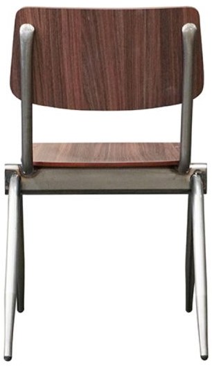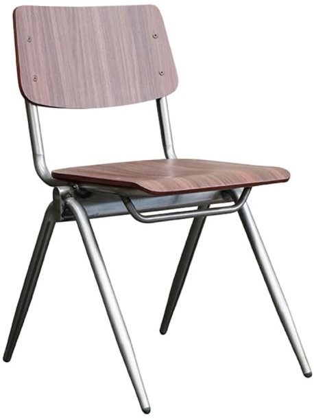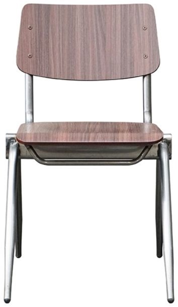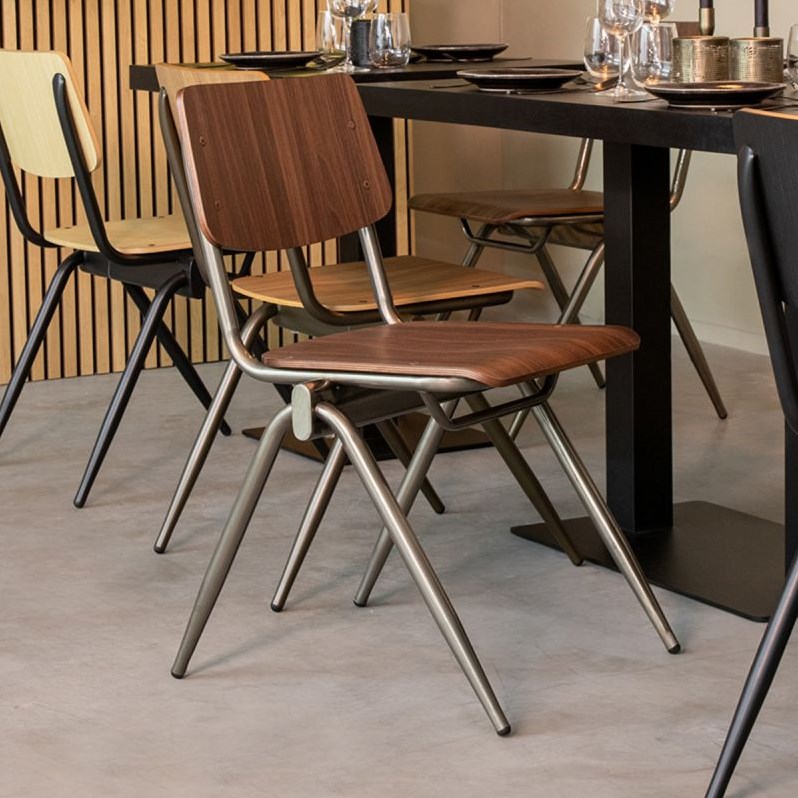 Deze houten schoolstoel is met zijn tijdloze simpele ontwerp een stijlvolle en functionele toevoeging aan elk kantine- of kantoor interieur. Deze houten stoel heeft een strak design met een metalen frame in gun metal kleur en een zit- en rugleuning van HPL (High Pressure Laminate). De combinatie van het donkere hout en het metalen onderstel zorgt voor een minimalistische, industriële uitstraling. De robuuste look van deze eetkamerstoel maakt hem ideaal voor moderne, industriële én Scandinavische kantines.