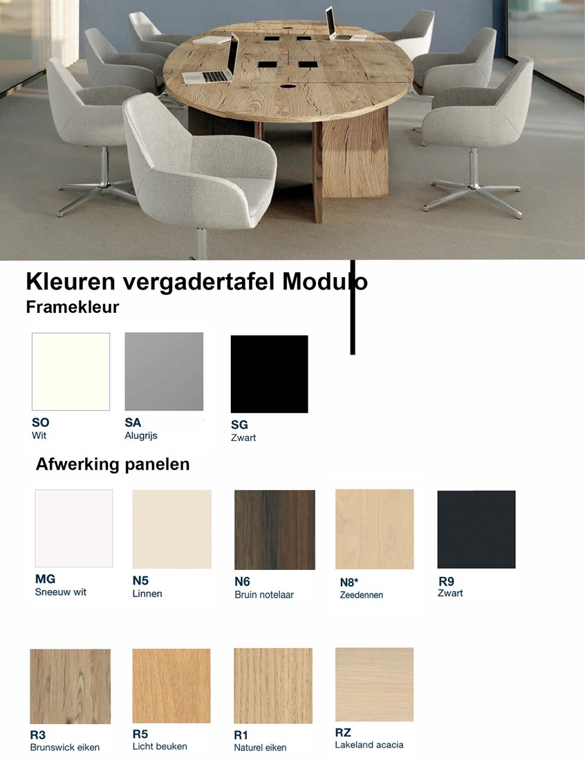 De tafelbladen zijn leverbaar in meerdere melamine kleuren. De bladen zijn beschikbaar 5 moderne kleuren. Hierdoor stem je de vergadertafel eenvoudig af op de stijl van de ruimte. Voor het frame heb je keuze uit paneelpoten in melamine of stevige metalen poten in wit, zwart of aluminium