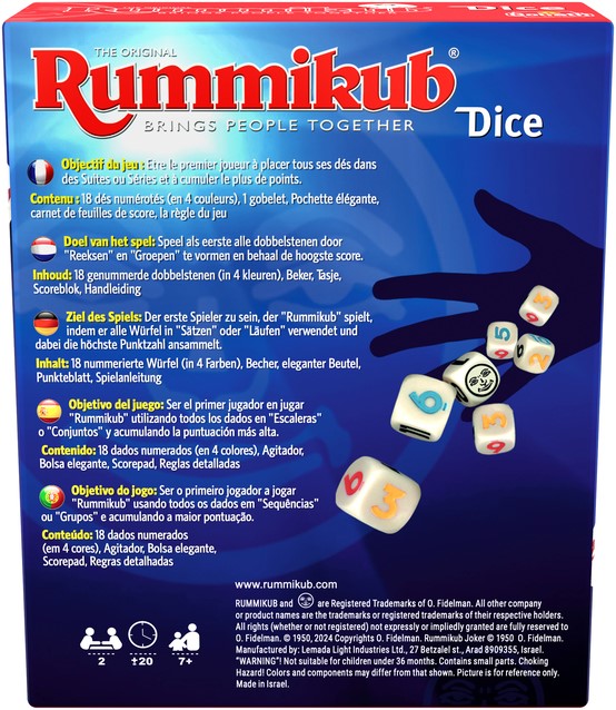 Ontdek "Rummikub Dice" - de perfecte mix van het klassieke Rummikub en dobbelspel-plezier! Rummikub Dice is snel, eenvoudig en biedt speelplezier voor jong en oud. Gooi de dobbelstenen om de beurt met de beker, vorm groepjes of reeksen, en wie als eerste al zijn dobbelstenen wegwerpt wint! Om te beginnen schrijf je alle namen om het scoreblok. Aan het begin van de ronde pakt de speler 9 dobbelstenen uit het zakje en stopt ze in de beker en gooit de dobbelstenen op tafel. Zodra er een set gegooid is dient deze op tafel geplaatst te worden. Wanneer er geen set is gegooid moet er gekeken worden of de dobbelstenen bij een reeks gelegde sets aangelegd kan worden. Wanneer een speler geen dobbelstenen aan kan leggen of reeksen kan vormen is de volgende speler aan de beurt. De ronde is voorbij zodra een speler alle dobbelstenen heeft opgelegd. Of wanneer een speler 3 rondes achter elkaar niet heeft kunnen aanleggen. Vanaf de tweede beurt in een ronde, mag een speler kiezen of hij een deel van de dobbelstenen wil gooien, of dat ze allemaal opnieuw gegooid worden. De speler die als eerste alle dobbelstenen heeft uitgespeeld wint het puntenaantal gelijk aan alle overgebleven dobbelstenen van de tegenstanders. De speler die aan het einde van 6 rondes de meeste punten heeft wint het spel.