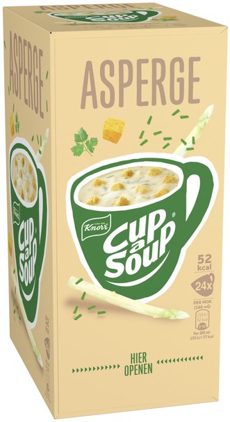 • Cup-a-Soup Asperge: een snelle, hartige opkikker die je weer energie geeft om door te gaan! Deze heerlijke soep is gemaakt met duurzaam geteelde asperges, en dat proef je!