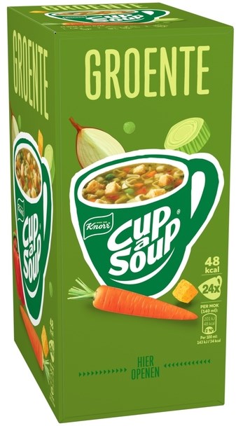 • Een goed gevulde groentesoep met smaakvolle rode paprika, ui, wortel, erwt, knolselderij, prei en knapperige croutons. In een verpakking Cup-a-Soup Groente zitten 24 heerlijke zakjes Cup-a-Soup.